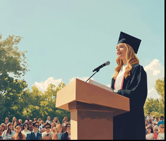 Grace delivers what the local newspaper later calls “a moving and triumphant valedictory address” and returns to her seat accompanied by a standing ovation. The principal says a very brief farewell and wishes them all good luck as they go forward “into the unknown.”